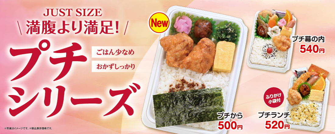 人気のプチシリーズがさらに充実。ご飯は少なめ、おかずはしっかりでランチにもぴったりのお弁当が勢揃い。ワンコインの「プチから」もぜひお試しください!